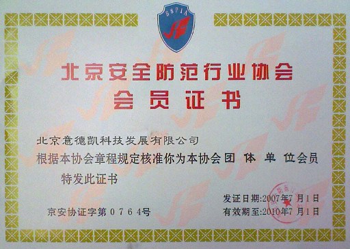 科雷通弱电工程有限公司北京安全防范协会会员证书