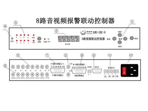 实现功能:平时接收8路音视频信号并输出给硬盘录像机。当报警信号出现后,报警指示灯亮,音视频输出切换到报警电梯的音视频图像,广播音频信号自动接入到该部电梯传输电缆上,传输给前端调制器的控制端连接的喇叭,实现视频、报警、对讲。