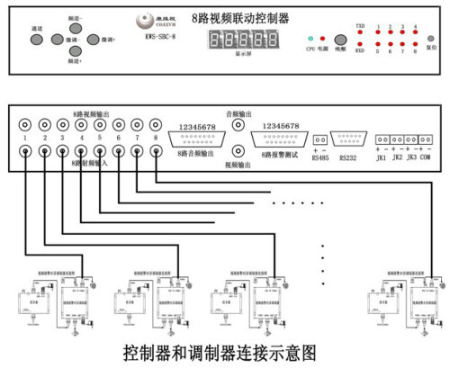 视频联动控制系统核心设备是由单路音视频控制调制器(简称:调制器)、8路音视频联动控制器(简称:控制器)、视频联动切换器(简称切换器)、管理电脑组成。在配上拾音器、广播喇叭、广播功放就可以组成电梯视频报警对讲联动监控系统。
