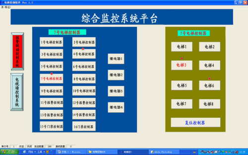 在视频报警联动控制系统中,每个电梯控制器可以控制8部电梯。系统最多可以连接16台控制器。当电梯内人员按动报警按钮时,音视频监视器将自动切换到报警电梯的图像,间听到电梯内声音,选择“继电器1”接通广播信号,实现对讲。广播功放的音频输入连接在电脑音频输出口,用连在电脑上的麦克进行对话。